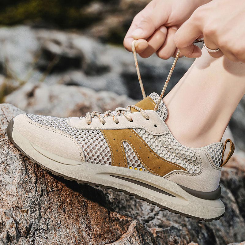 The open mesh upper allows maximum airflow to keep your feet cool and dry, even during long walks or warm days. Reinforced panels add durability and structure where you need it most, while the cushioned midsole absorbs impact to reduce foot fatigue on uneven surfaces.