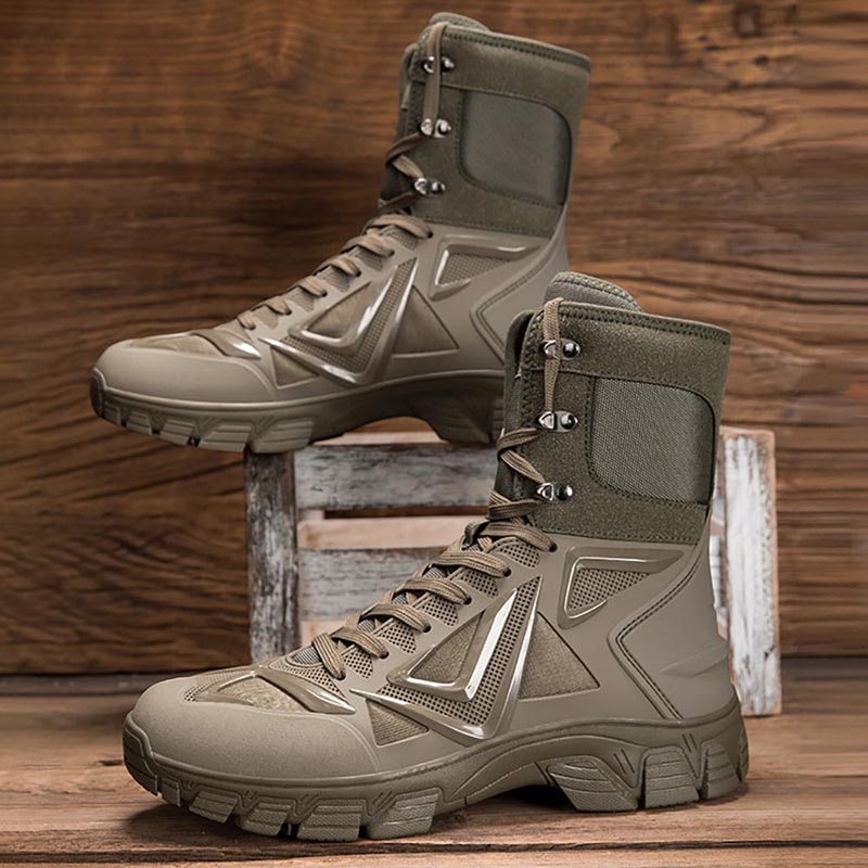 Designed for tough outdoor conditions and tactical use, these men’s high-top combat boots deliver reliable protection, durability, and support. The upper combines TPU reinforcement with breathable mesh fabric, offering strong abrasion resistance while allowing airflow during extended wear.