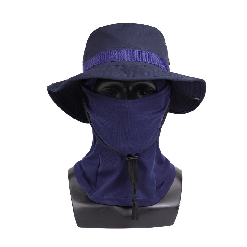 All-in-One Protection – Wide brim hat with integrated face cover for sun, wind, and dust protection