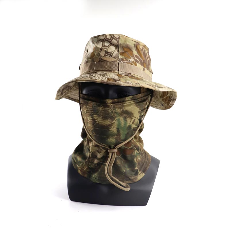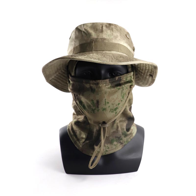 Wide brim hat combined with face cover and neck guard to help protect your face, neck, and head from sun, wind, and dust.